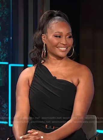 on E! News on E! was spotted wearing this black ruched one-shoulder dress on E! News Daily Pop on Oct 01 2021's episode. 's Dress is the Diana Ruched One-Shoulder Gown by Norma Kamali.