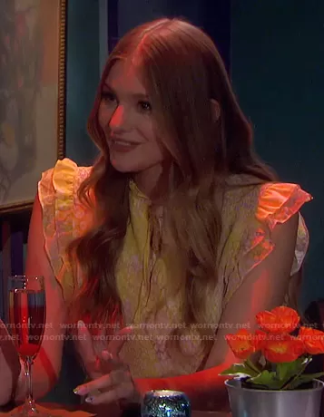 Alice Caroline Horton (played by Lindsay Arnold) on Days of our Lives on Peacock was spotted wearing this yellow animal print ruffle dress on Days of our Lives on Oct 02 2021's episode. Allie's Dress is the Dream Girl Dress by BB Dakota.
