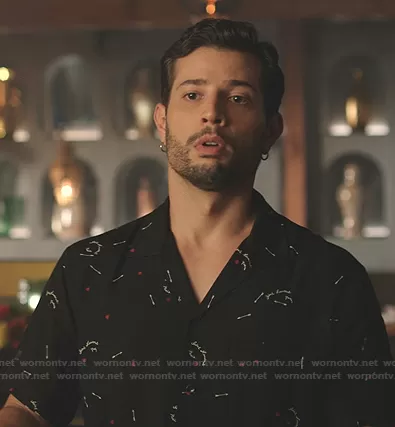 Sam Flores (played by Rafael de la Fuente) on Dynasty on The CW was spotted wearing this black arrow print shirt on Dynasty on episode 'Filled With Manipulations and Deceptions' (4x22) in Oct 2021. Sam's Shirt is the Heart Logo Print Short Sleeve Button-Up Camp Shirt by Saint Laurent.