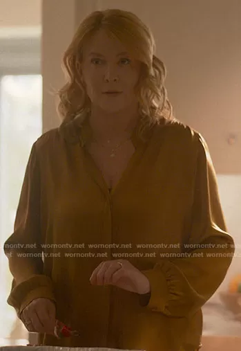(played by ) on The L Word Generation Q on Showtime was spotted wearing this gold blouse on The L Word Generation Q on episode 'Last Dance' (2x09) in Oct 2021. 's Top is the Bianca Blouse by L'Agence.