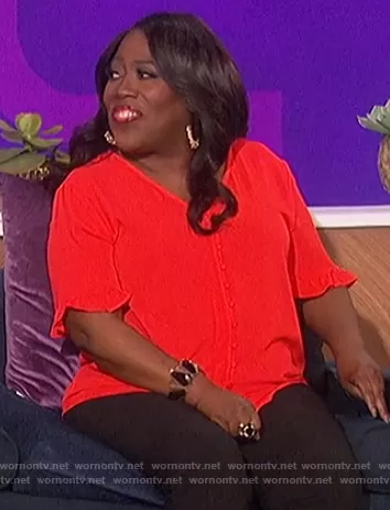 Sheryl Underwood on The Talk on CBS was spotted wearing this red button down blouse on The Talk on Oct 04 2021's episode. Sheryl's Top is the Ruffle Sleeve Crepe Blouse by CeCe.