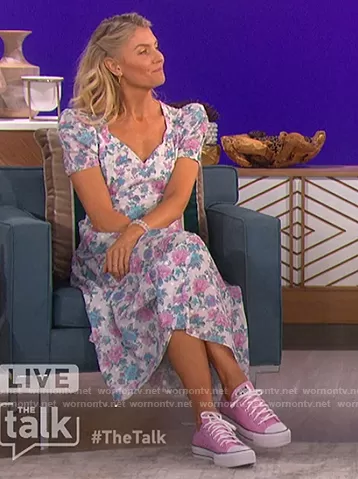 Amanda Kloots on The Talk on CBS was spotted wearing this floral print midi dress on The Talk on Oct 04 2021's episode. Amanda's Dress is the Hutchinson Dress by LoveShackFancy.