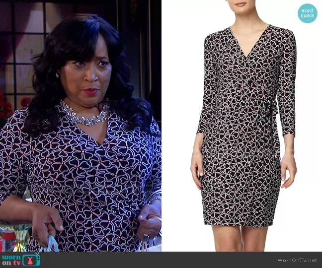 Paulina Price (played by Jackée Harry) on Days of our Lives on Peacock was spotted wearing this black clover print wrap dress on Days of our Lives on Oct 05 2021's episode. Paulina's Dress is the Bohemian Clover Faux Wrap Dress by Anne Klein.