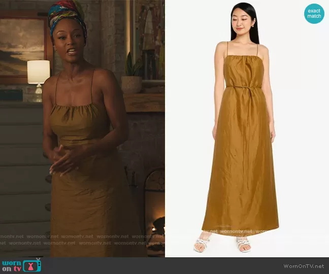 Angela Vaughn (played by Yaya DaCosta) on Our Kind of People on FOX was spotted wearing this green linen midi dress on Our Kind of People on episode 'For Colored Boys...' (1x06) in Nov 2021. Angela's Dress is the Strappy Shirred Maxi Dress by Banana Republic.