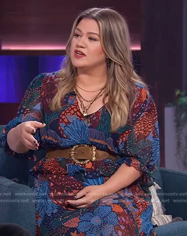 Kelly Clarkson on The Kelly Clarkson Show on NBC was spotted wearing this floral and leopard print maxi dress on The Kelly Clarkson Show on Oct 06 2021's episode. Kelly's Dress is the Blue Cool Leopard Ruffle Maxi Dress by Farm RIO.