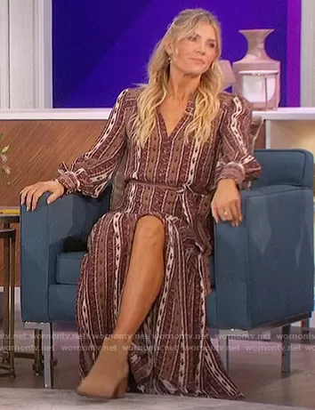 Amanda Kloots on The Talk on CBS was spotted wearing this printed stripe tie waist dress on The Talk on Oct 06 2021's episode. Amanda's Dress is the Maidens Satin Maxi Dress by Veronica Beard.