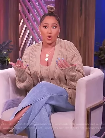 Adrienne Houghton on The Real on BETher was spotted wearing this beige cardigan on The Real on Oct 06 2021's episode. Adrienne's Sweater is the Chakra Ribbed Knit Cardigan by Aeron.