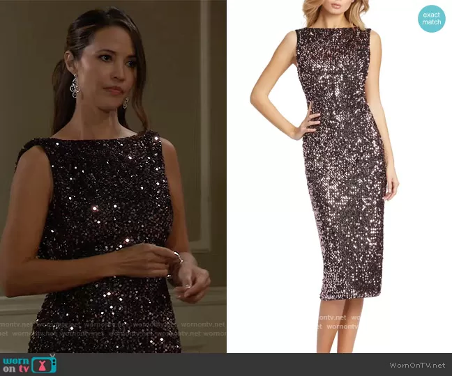 (played by ) on General Hospital on ABC was spotted wearing this sequin sheath dress on General Hospital on Oct 07 2021's episode. 's Dress is the Back Ruffle Sequin Sheath Dress by Ieena for Mac Duggal.