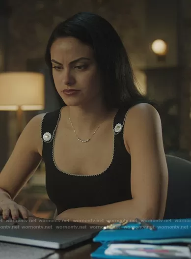 Veronica Lodge (played by Camila Mendes) on Riverdale on The CW was spotted wearing this black contrast trim tank top on Riverdale on episode 'RIVERDALE: RIP' (5x19) in Oct 2021. Veronica's Top is the Arsene Contrast-Trim Tank Top by Sandro.