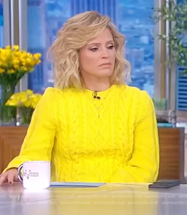 Sara Haines on The View on ABC was spotted wearing this yellow cable knit sweater on The View on Oct 07 2021's episode. Sara's Sweater is the Cable-knit cotton-blend sweater by Stella McCartney.