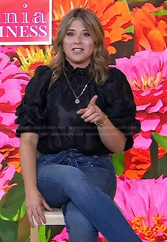 Jenna Bush Hager on Today on NBC was spotted wearing this black floral top and tie waist jeans on Today on Oct 08 2021's episode. Jenna's Top is the Julia Blouse by Hofmann Copenhagen . Jenna's Pants is the Giselle High Rise Flare Skinny Jeans by Veronica Beard.