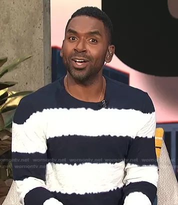 Justin Sylvester on E! News on E! was spotted wearing this tie dye stripe top on E! News Daily Pop on Oct 08 2021's episode. Justin's Shirt is the Cotton Textured Tie Dyed Stripe Long Sleeve Tee by ATM Anthony Thomas Melillo.