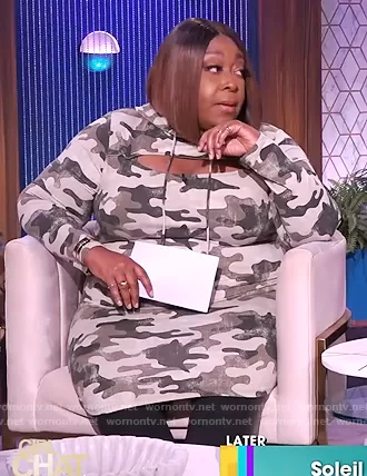 Loni Love on The Real on BETher was spotted wearing this camo cutout dress on The Real on Oct 08 2021's episode. Loni's Dress is the Trendy Plus Size Cutout Hoodie Dress by Almost Famous.