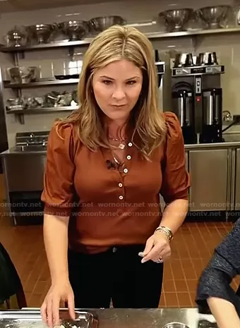 Jenna Bush Hager on Today on NBC was spotted wearing this Jenna’s brown button down top on Today on Aug 02 2022's episode. Jenna's Top is the Coralee Puff-Sleeve Top by Veronica Beard.