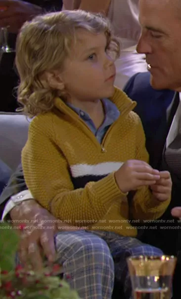 (played by ) on The Young and the Restless on CBS was spotted wearing this yellow striped sweater and plaid pants on The Young and the Restless on Oct 12 2021's episode. 's Sweater is the Textured Stripe Half-Zip Sweater by Janie and Jack . 's Pants is the Plaid Tapered Joggers by Janie and Jack.