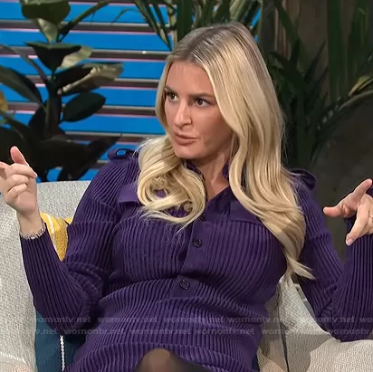 Morgan Stewart on E! News on E! was spotted wearing this purple ribbed dress on E! News Daily Pop on Oct 11 2021's episode. Morgan's Dress is the Ribbed-Knit Softly-Textured Mini Dress by Bottega Veneta.