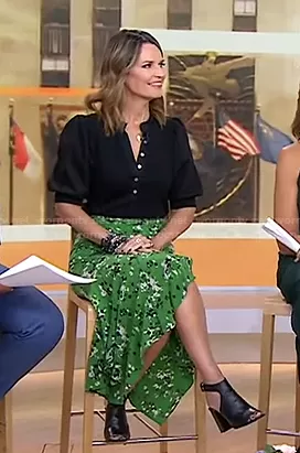Savannah Guthrie on Today on NBC was spotted wearing this black top and green print skirt on Today on Oct 12 2021's episode. Savannah's Top is the Coralee Puff-Sleeve Top by Veronica Beard . Savannah's Skirt is the Mac Asymmetric Floral Skirt by Veronica Beard.