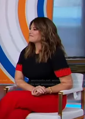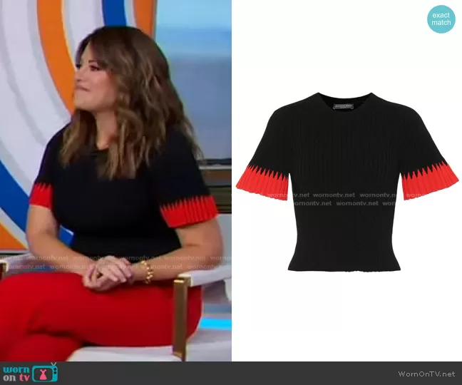 on Good Morning America on ABC was spotted wearing this black ribbed short sleeve sweater on Good Morning America on Oct 12 2021's episode. 's Sweater is the Ribbed Wool and Sashmere-Blend sweater by Alexander McQueen.
