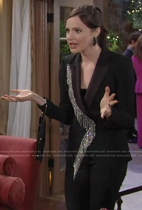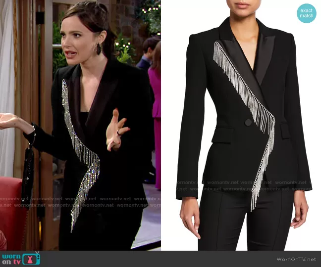 Tessa Porter (played by Cait Fairbanks) on The Young and the Restless on CBS was spotted wearing this crystal fringed blazer on The Young and the Restless on Oct 13 2021's episode. Tessa's Jacket is the Clarise Rhinestone Fringe Jacket by Veronica Beard.