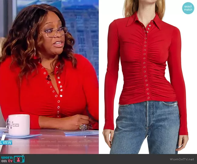 on The View on ABC was spotted wearing this red button front blouse on The View on Oct 13 2021's episode. 's Top is the Larsen Ruched Polo Top by A.L.C..