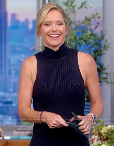 Sara Haines on The View on ABC was spotted wearing this navy ribbed sweater dress on The View on Oct 14 2021's episode. Sara's Dress is the Regina Ribbed Body-Con Sleeveless Sweater Dress by Ramy Brook.