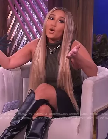 Adrienne Houghton on The Real on BETher was spotted wearing this green knit turtleneck top on The Real on Oct 13 2021's episode. Adrienne's Top is the Darina Mock Neck Tank by Alice + Olivia.