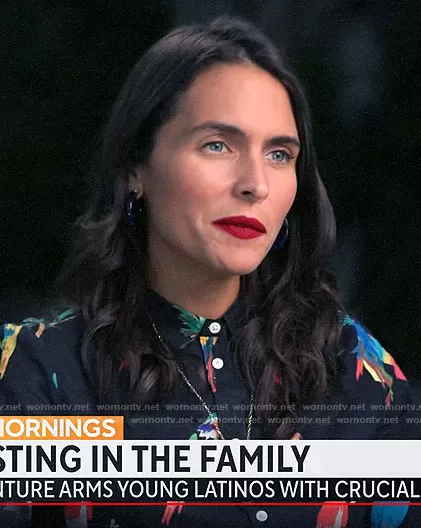 Lilia Luciano on CBS Mornings on CBS was spotted wearing this black parrot print shirt on CBS Mornings on Oct 14 2021's episode. Lilia's Top is the Pierro Shirt in Black Jungle by Sezane .