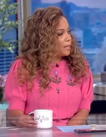 Sunny Hostin on The View on ABC was spotted wearing this pink floral embroidered sweater on The View on Oct 15 2021's episode. Sunny's Sweater is the Floral Embroidery Knit Top by Gucci.