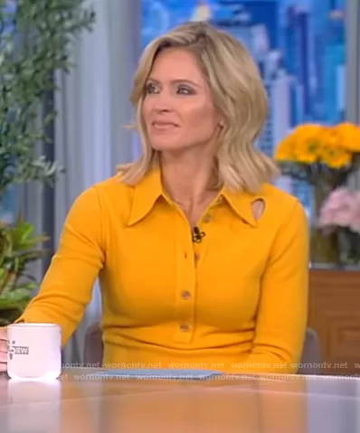 Sara Haines on The View on ABC was spotted wearing this yellow cutout shirtdress on The View on Oct 15 2021's episode. Sara's Dress is the Wool Blend Flare Shirtdress by 3.1 Phillip Lim.