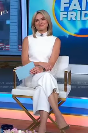 Amy Robach on Good Morning America on ABC was spotted wearing this white mock neck sleeveless jumpsuit on Good Morning America on Oct 15 2021's episode. Amy's Jumpsuit is the Symone Jumpsuit by Club Monaco.