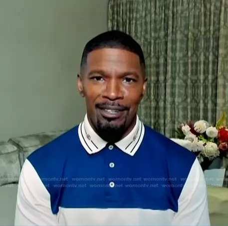 on E! News on E! was spotted wearing this blue and white colorblock polo shirt on E! News on Oct 18 2021's episode. 's Shirt is the Embroidered-Collar Polo Shirt by Gucci.