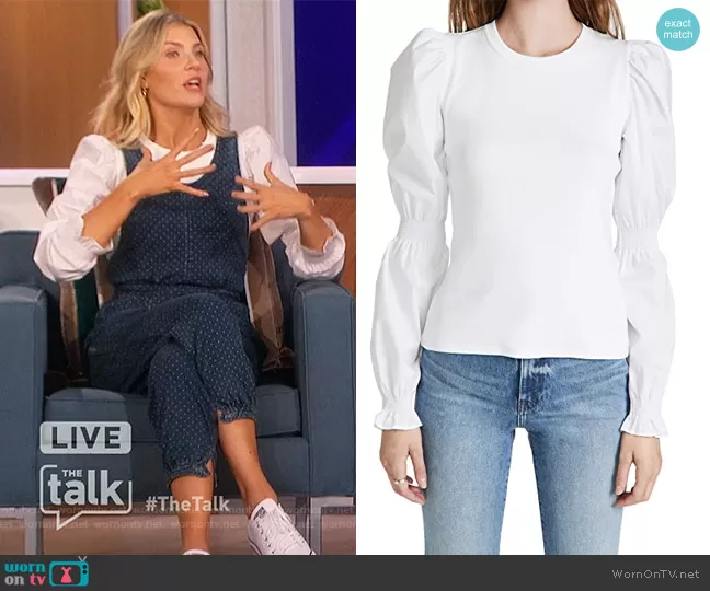 Amanda Kloots on The Talk on CBS was spotted wearing this white puff sleeve blouse and denim jumpsuit on The Talk on Oct 18 2021's episode. Amanda's Top is the Fawn Puff-Sleeve Top by Veronica Beard . Amanda's Jumpsuit is the Polka-Dot Indigo Jersey Jumpsuit by Ralph Lauren.