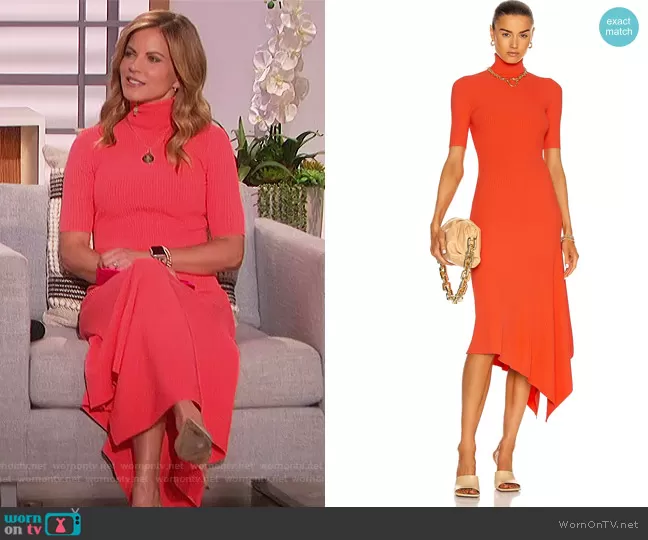 Natalie Morales on The Talk on CBS was spotted wearing this coral ribbed asymmetric dress on The Talk on Oct 18 2021's episode. Natalie's Dress is the Erynna Turtleneck Dress by A.L.C..