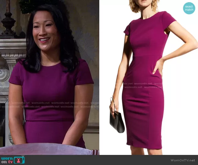 Melinda Trask (played by Tina Huang) on Days of our Lives on Peacock was spotted wearing this purple cap sleeve dress on Days of our Lives on Oct 19 2021's episode. Melinda's Dress is the Mila Cap-Sleeve Crepe Sheath Dress by Dress The Population.