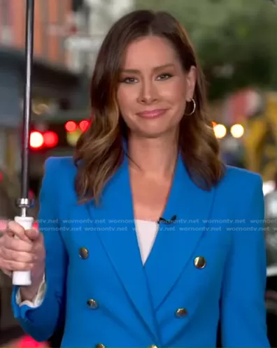 Rebecca Jarvis on Good Morning America on ABC was spotted wearing this blue double breasted blaer on Good Morning America on May 30 2023's episode. Rebecca's Jacket is the Tailored Double Breasted Blazer by Zara.