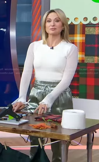 Amy Robach on Good Morning America on ABC was spotted wearing this white sheer sleeve top and satin pants on Good Morning America on Oct 19 2021's episode. Amy's Sweater is the Sheer-Sleeve Sweater by Theory . Amy's Pants is the Adalie Hammered Satin Drawstring Pants by Cinq a Sept.
