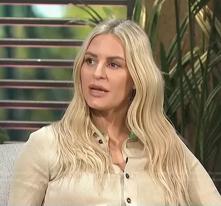 Morgan Stewart on E! News on E! was spotted wearing this beige ribbed shirtdress on E! News Daily Pop on Oct 19 2021's episode. Morgan's Dress is the Rib Long Sleeve Stretch Silk Blend Military Sweater Dress by Bottega Veneta.