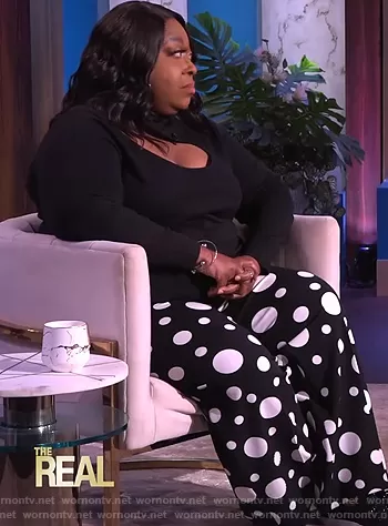 Loni Love on The Real on BETher was spotted wearing this black cutout sweater and printed pants on The Real on Oct 19 2021's episode. Loni's Sweater is the Cutout Neckline Turtleneck by Eloquii . Loni's Pants is the Dot Crepe Wide Leg Pants by Ashley Stewart.