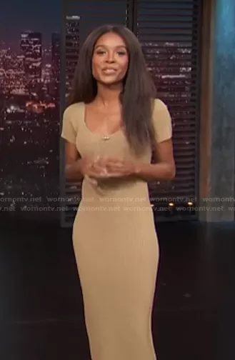 Zuri Hall on Access Hollywood on NBC was spotted wearing this beige ribbed knit dress on Access Hollywood on Oct 19 2021's episode. Zuri's Dress is the Melissa Ribbed Knit Midi Dress by Line & Dot.