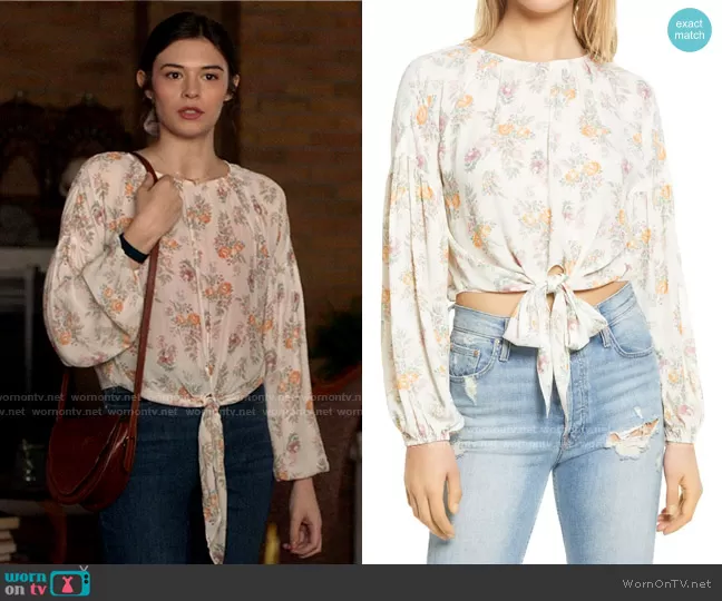 Nia Nal (played by Nicole Maines) on Supergirl on The CW was spotted wearing this white floral tie front top on Supergirl on episode 'Nightmare in National City' (6x16) in Oct 2021. Nia's Top is the Aliso Top in Ivory Floral by WAYF.