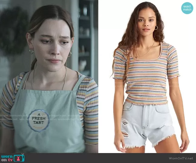 Love Quinn (played by Victoria Pedretti) on You on Netflix was spotted wearing this multicolor striped top on You on episode 'Missing White Woman Syndrome' (3x03) in Oct 2021. Love's Top is the Halfway There Top by Billabong.