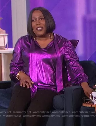 Sheryl Underwood on The Talk on CBS was spotted wearing this purple metallic tie neck blouse on The Talk on Oct 21 2021's episode. Sheryl's Top is the Metallic Bow Blouse by Eloquii.