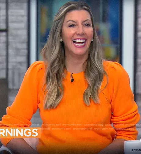 on CBS Mornings on CBS was spotted wearing this orange sweater on CBS Mornings on Oct 21 2021's episode. 's Sweater is the Darja Sweater by Veronica Beard.