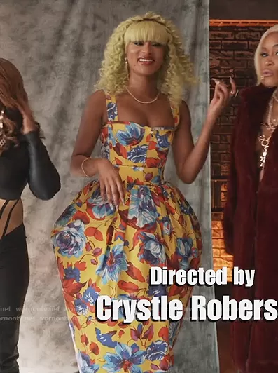Lauren Rice (played by Pepi Sonuga) on Queens on ABC was spotted wearing this yellow floral print top and skirt on Queens on episode 'Who Shot Ya' (1x07) in Dec 2021. Lauren's Top is the Topstitched floral-print cotton-twill bustier top by Christopher John Rogers . Lauren's Skirt is the Pleated floral-print cotton-twill maxi skirt by Christopher John Rogers.