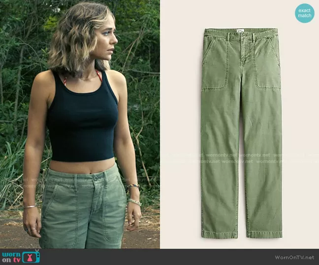 Lennon (played by Madison Iseman) on I Know What You Did Last Summer on Amazon Prime was spotted wearing this black crop top and green pants on I Know What You Did Last Summer on episode 'Mukbang' (1x05) in Oct 2021. Lennon's Pants is the Garment-dyed Foundry pant by J. Crew.