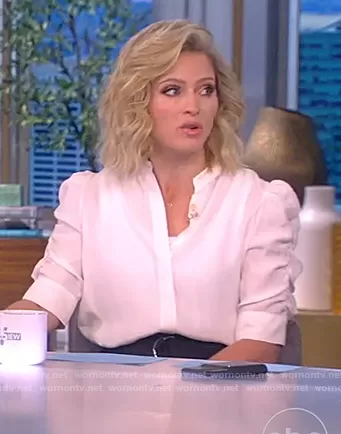 Sara Haines on The View on ABC was spotted wearing this white puff sleeve blouse on The View on Oct 25 2021's episode. Sara's Top is the Shirred Sleeve Silk Blouse by Frame.