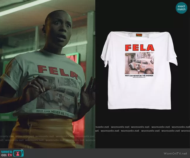 Issa Dee (played by Issa Rae) on Insecure on HBO was spotted wearing this white Fela graphic tee on Insecure on episode 'Reunited, Okay?!' (5x01) in Oct 2021. Issa's Top is the War Can Never Short Sleeve T-shirt by Fela Cuti.