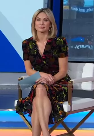 Amy Robach on Good Morning America on ABC was spotted wearing this black floral velvet dress on Good Morning America on Oct 26 2021's episode. Amy's Dress is the Gynn Ruched Velvet Floral Burnout Midi Dress by Milly.