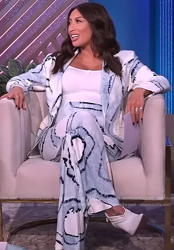 Jeannie Mai on The Real on BETher was spotted wearing this blue tie dye blazer and pants on The Real on Oct 26 2021's episode. Jeannie's Blazer is the Single Breasted Blazer by Norma Kamali . Jeannie's Pants is the Tie-dyed stretch-jersey flared pants by Norma Kamali.
