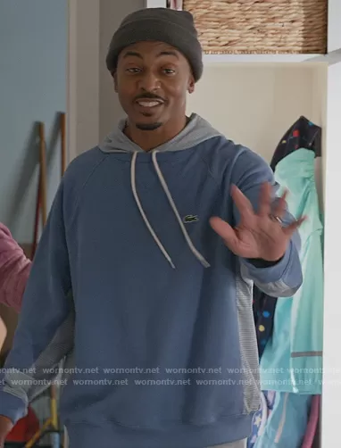 (played by ) on Queens on ABC was spotted wearing this blue contrast hooded sweatshirt on Queens on episode 'Heart of Queens' (1x02) in Oct 2021. 's Sweater is the Cotton Fleece Paneled Hooded Sweatshirt by Lacoste.